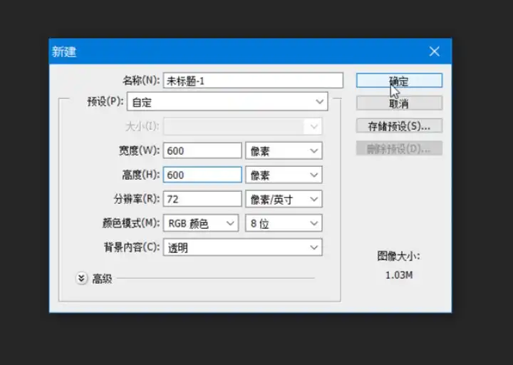 首先新建一个图层,点击左上角“文件” “新建”,600×600,背景透明即可