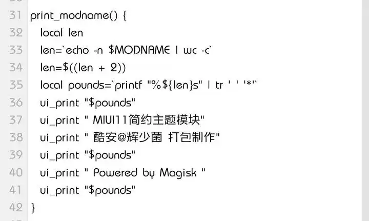 (update-binary)刷入模块时显示的内容,如果需要显示其他内容,请回车添加ui_print””、$pounds是分割线