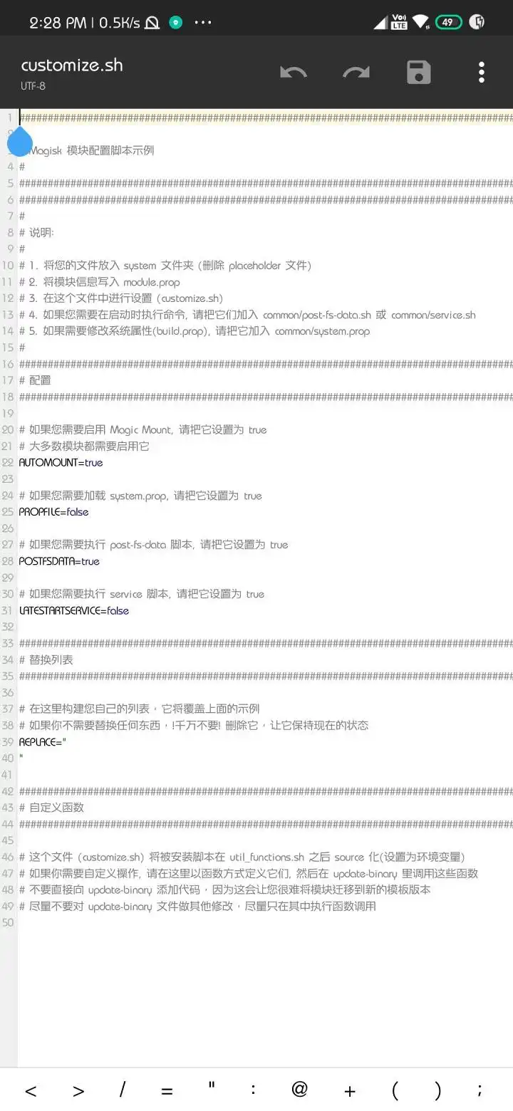 customize.sh文件内剩余的东西,我把老版config.sh内的东西移过来了,如果需要另添加代码,比如keytest()、chooseport()等交互性代码(有机会教程也会写出来)