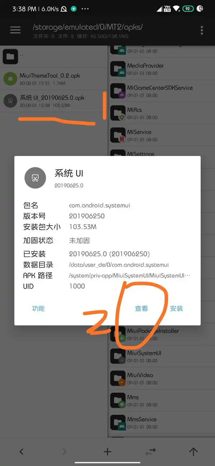 我们以com.android.systemui为例子,我们首先需要一个本机systemui的apk,我们可以利用 【MT管理器2】 侧边栏的安装包提取,也可以自行进入/system/priv-app/内寻找MiuiSystemUI,提取到内部存储后,我们点击apk,然后点查看
