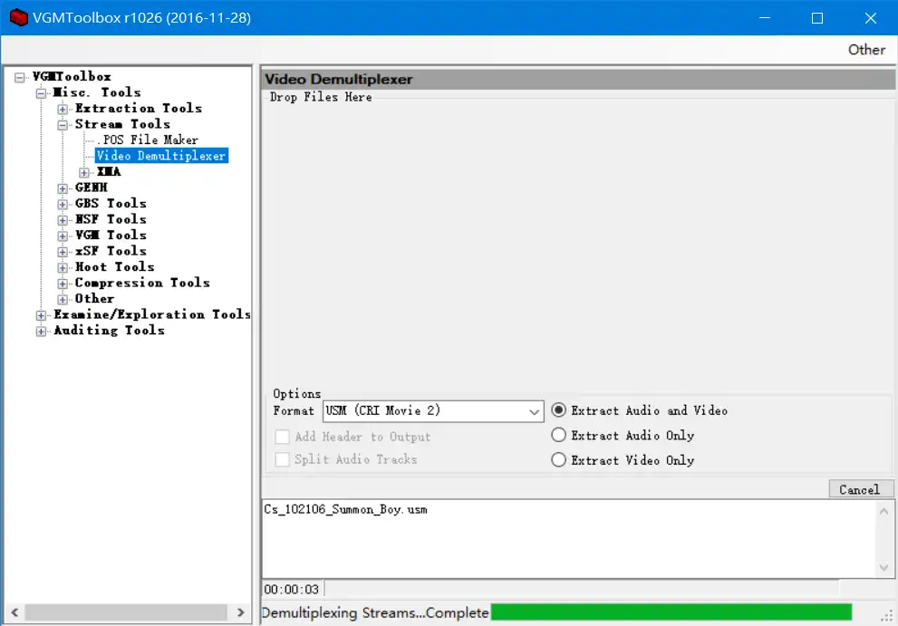 打开软件后,在侧边栏选择依次展开Misc. Tools和Stream Tools,然后进入Video Demultiplexer并在下拉框中选择USM(CRI Moive 2)