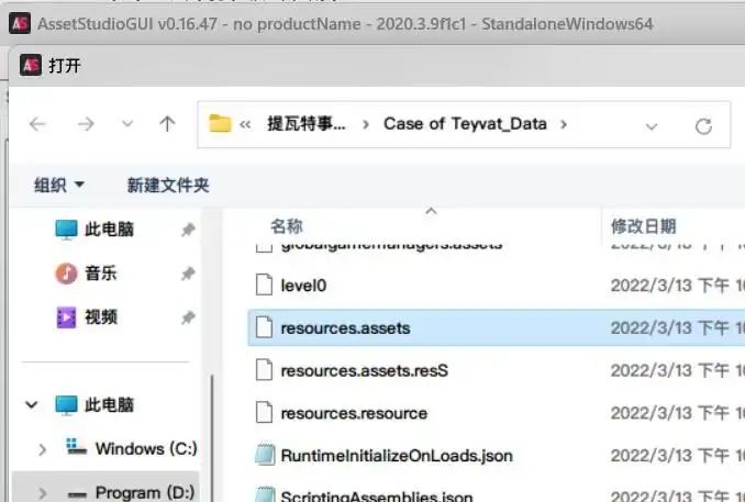 教程演示为提瓦特事件簿(里面的鸭鸭太太太太太好看辣),选择resources.asstes文件,如果你要提取的游戏没有,就选择一个.assets格式的文件,加载过程中弹出的弹窗一路确定即可