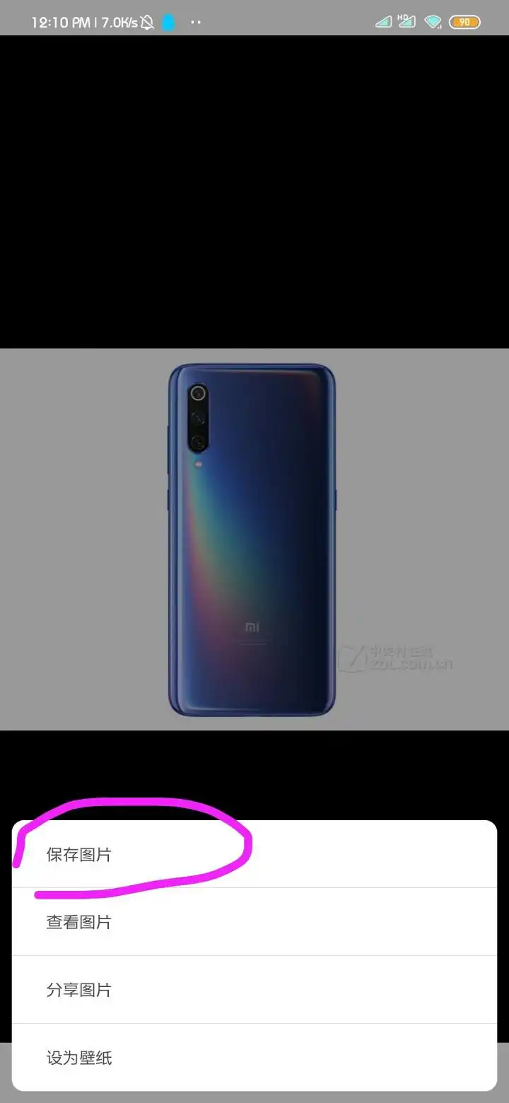 然后点击图片,长按图片,点击【保存图片】按钮(如果是新机小米商城上也有背面图,会更清晰点)